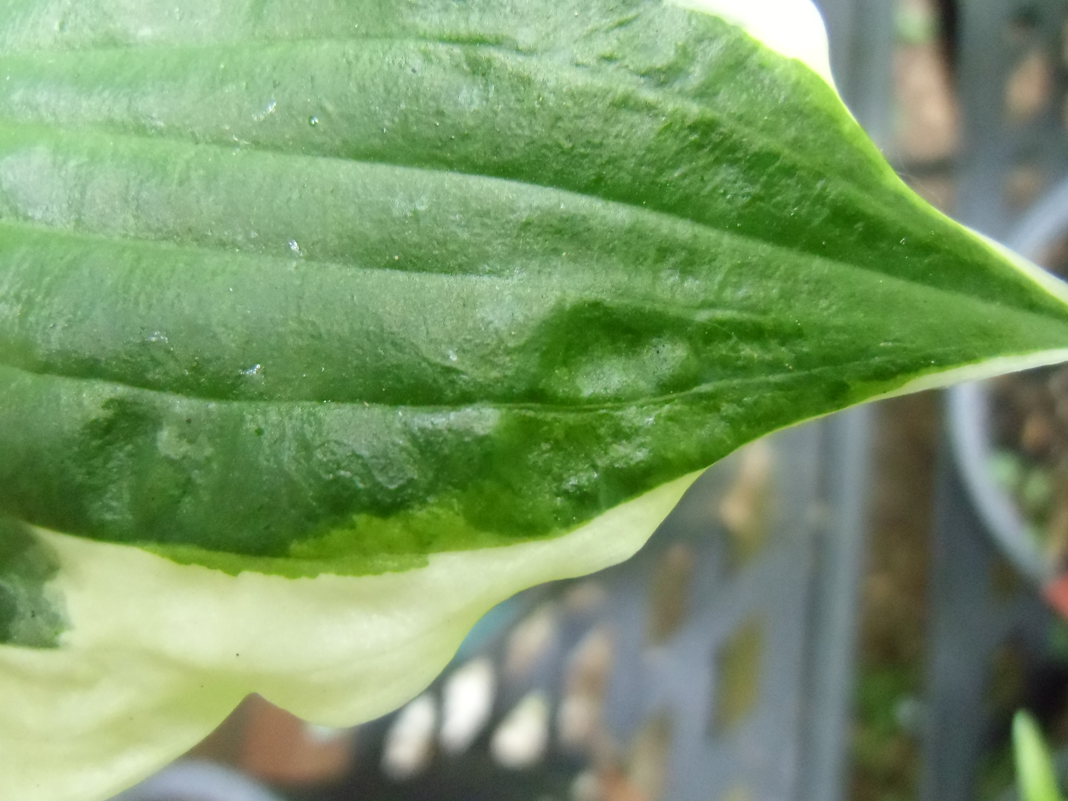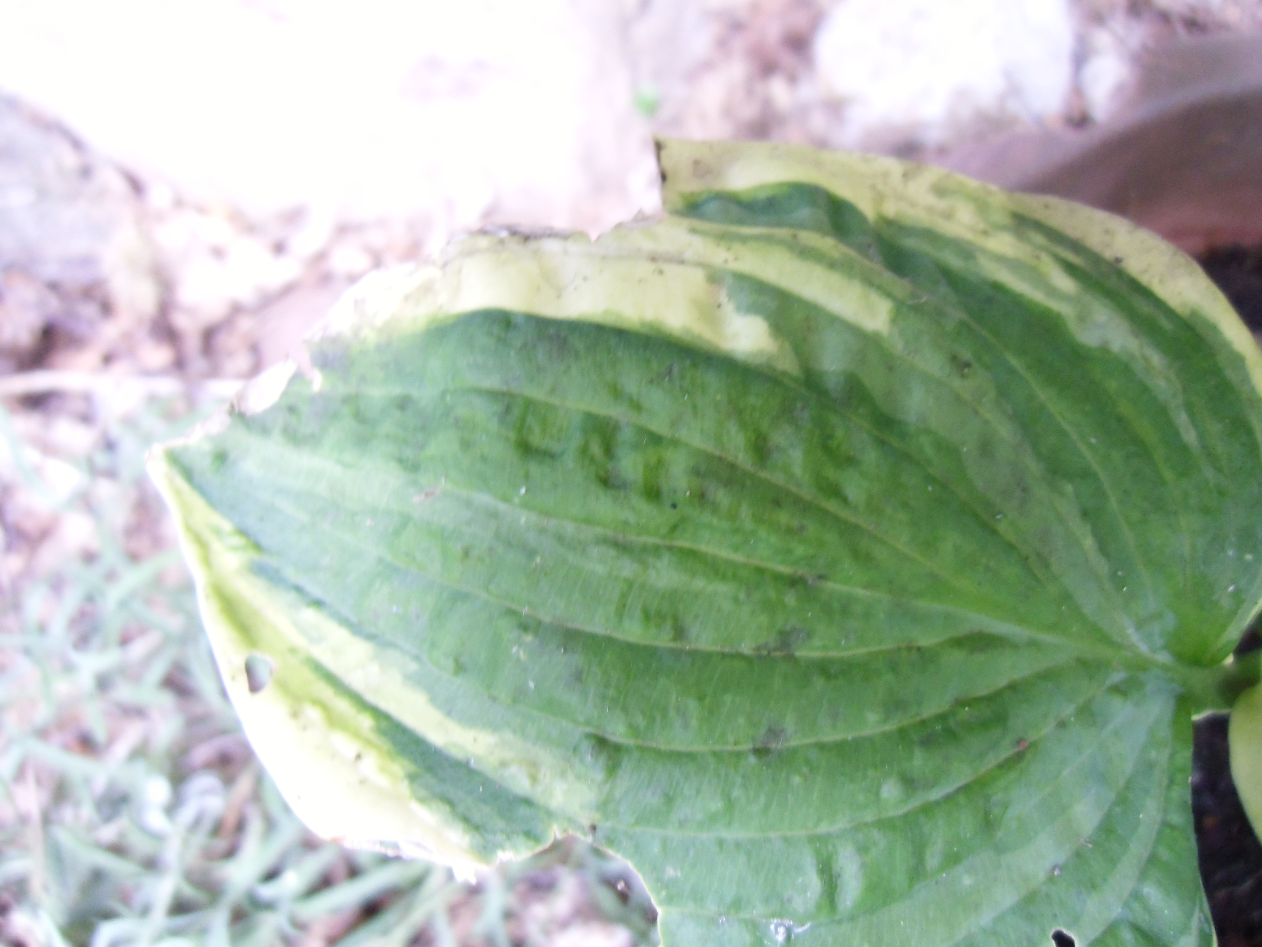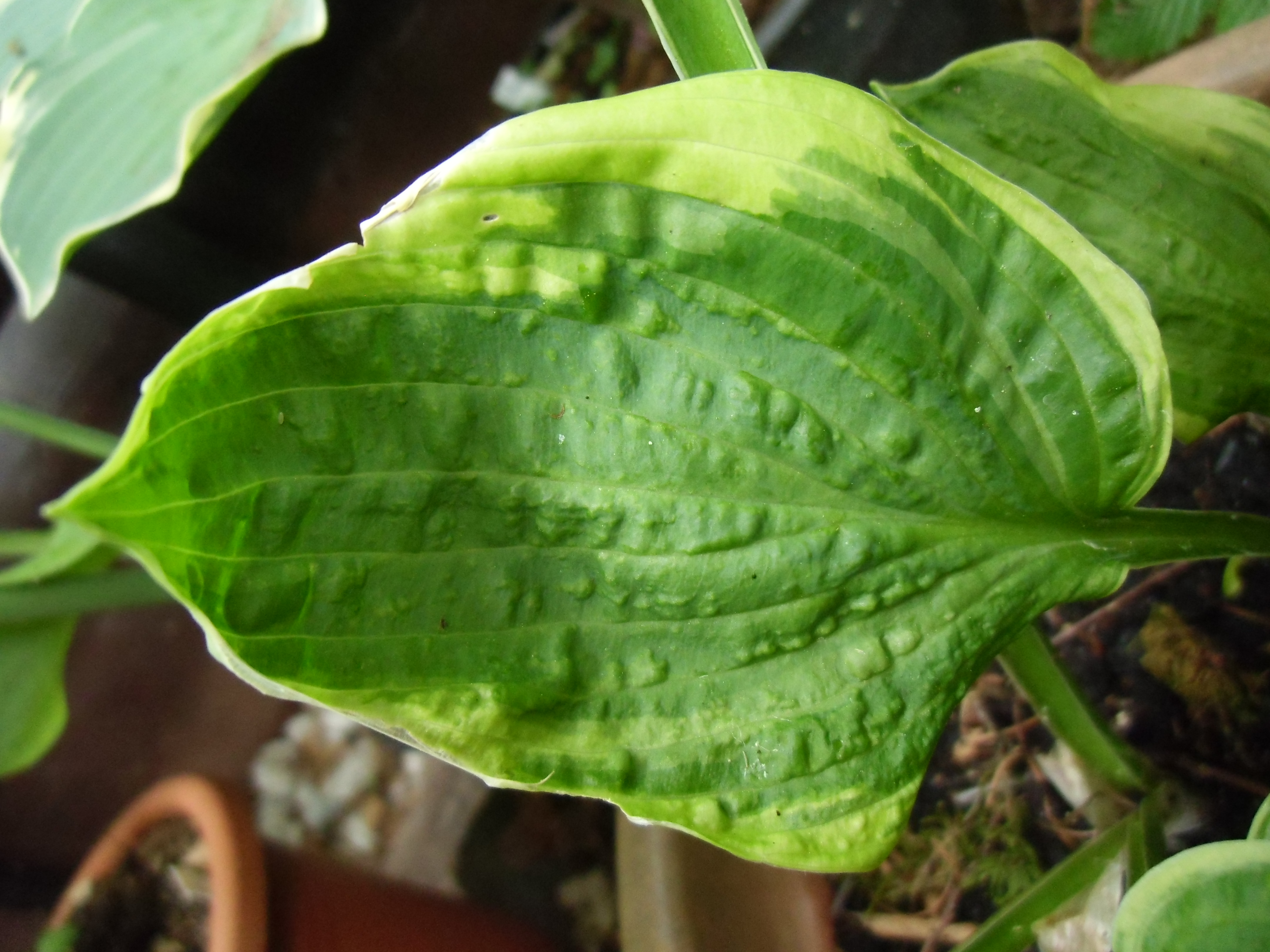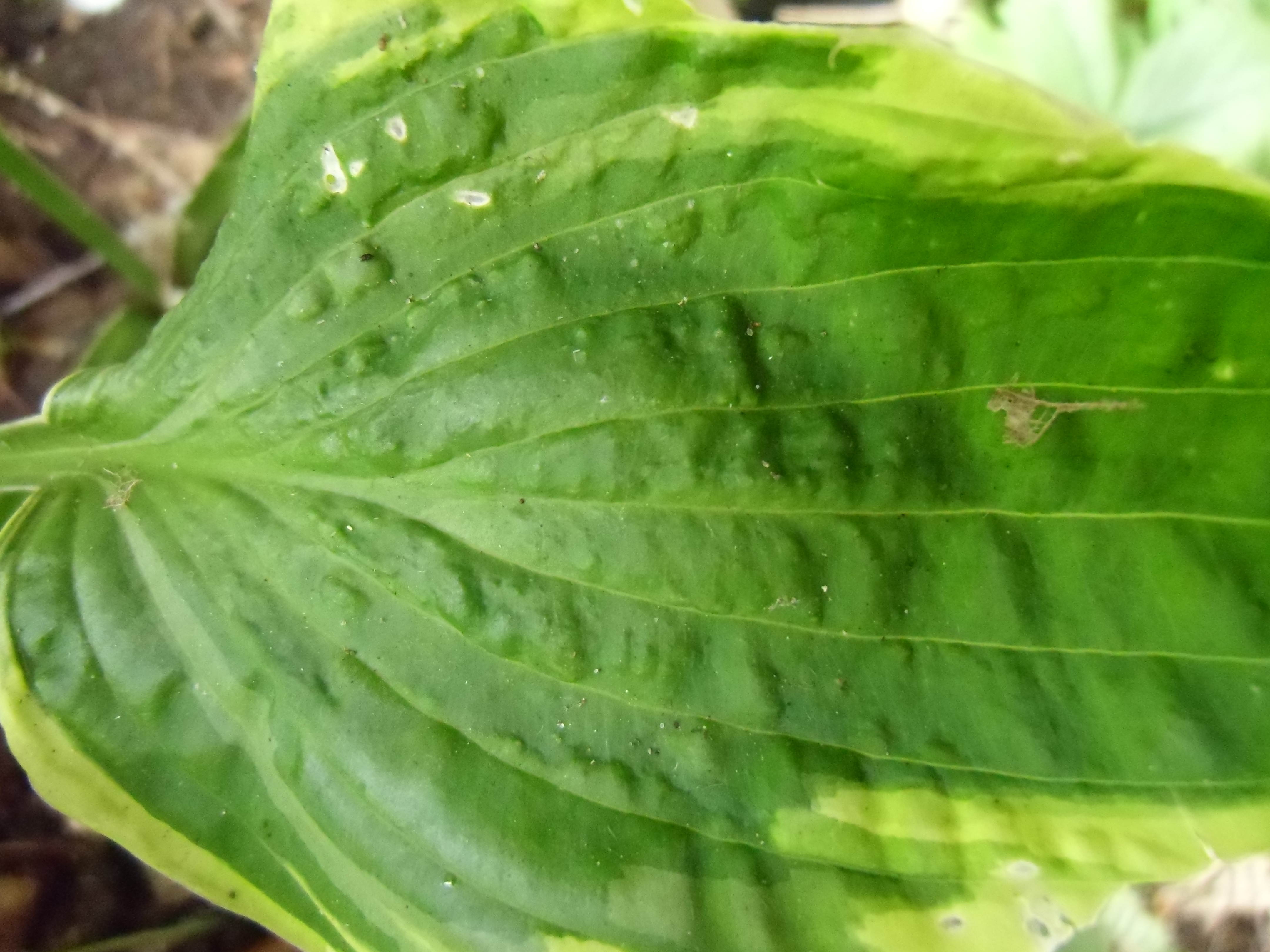 Diese beiden Hostas (Master-Stauden hat die als Sorte "Honeysong" verkauft) habe ich weggeworfen, da sie vermutlich mit dem Hosta-Virus HVX infiziert sind (Schadbild: "sunken/ collapsing tissue").