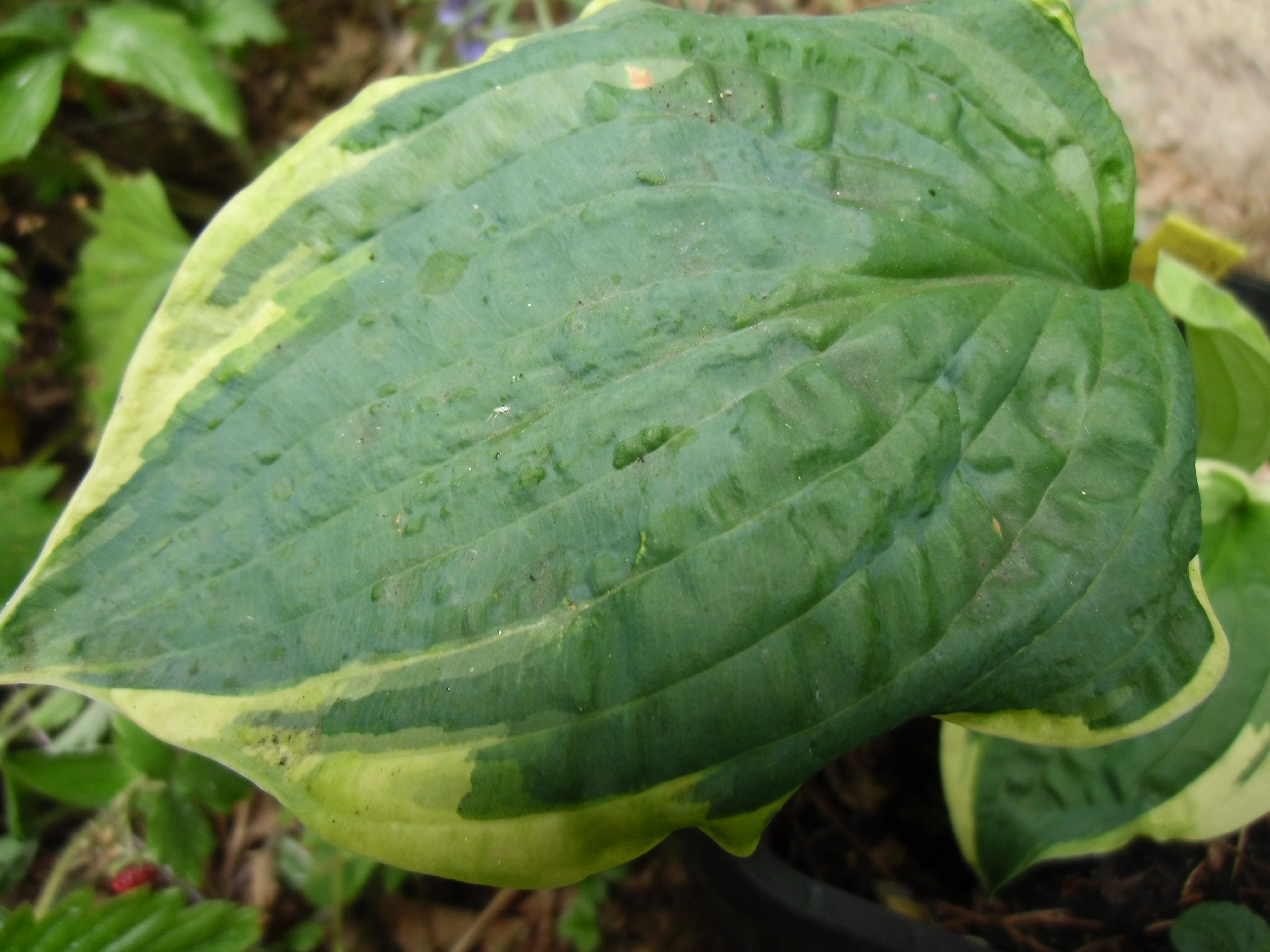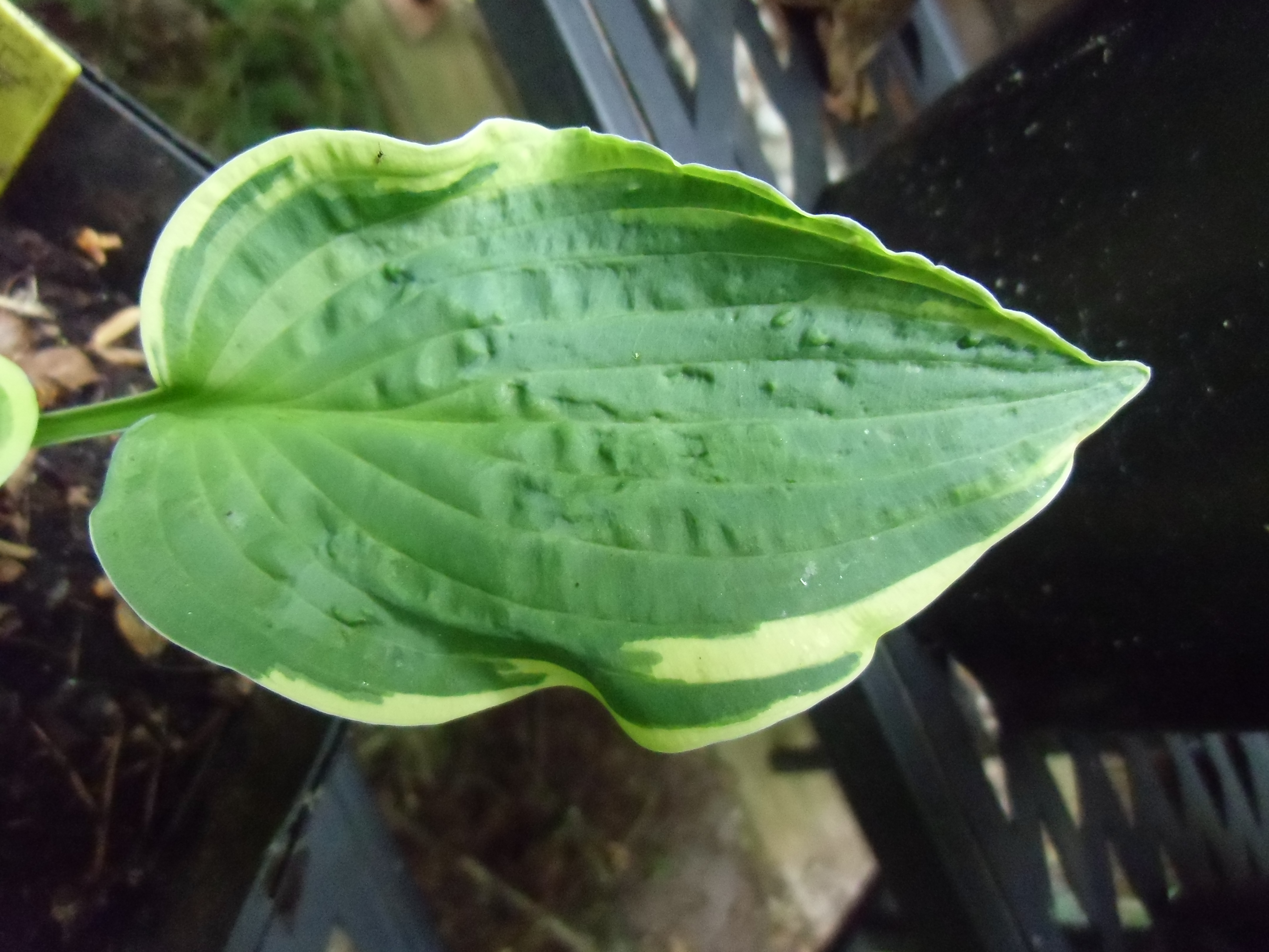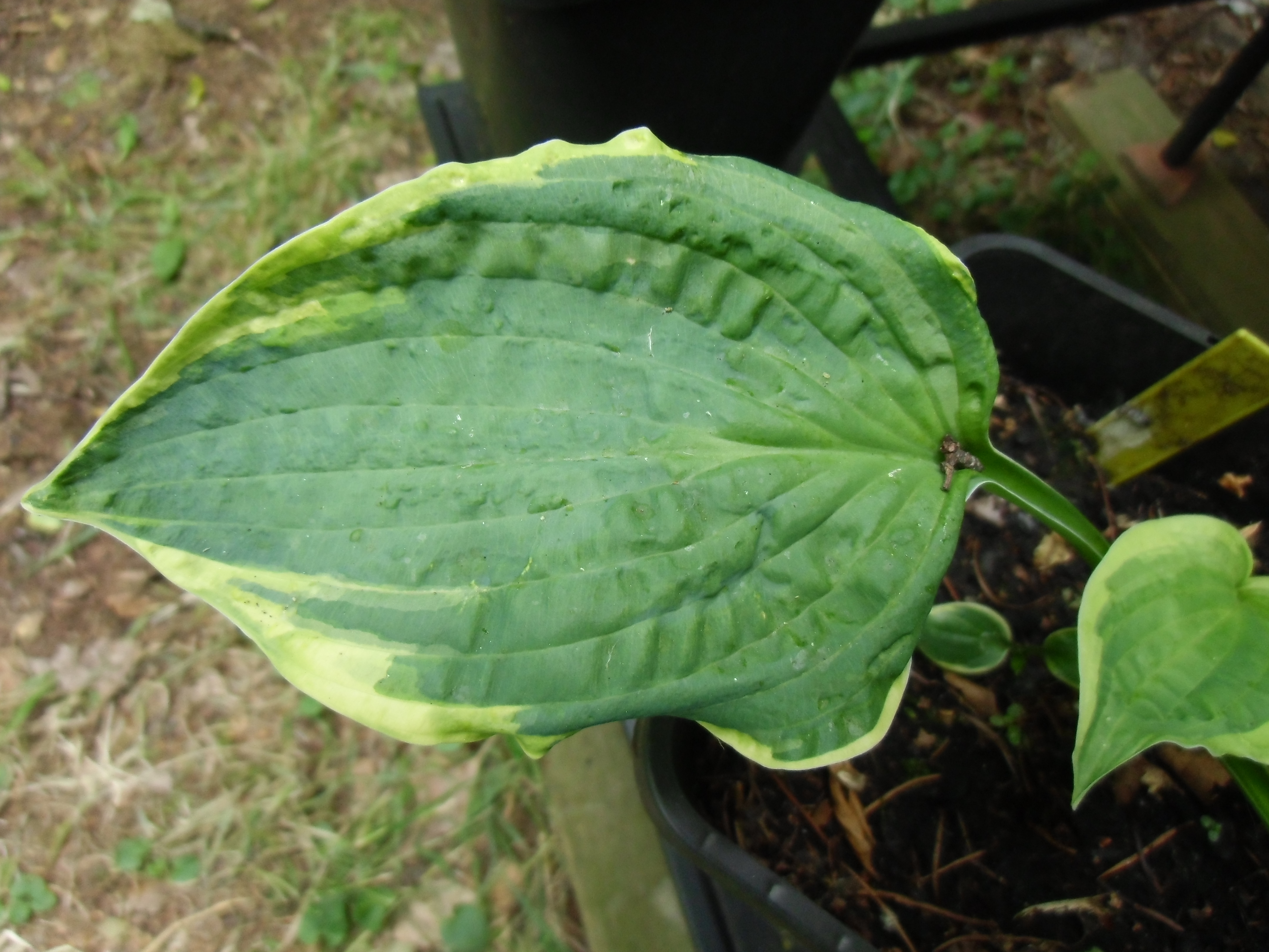 Diese beiden Hostas (Master-Stauden hat die als Sorte "Honeysong" verkauft) habe ich weggeworfen, da sie vermutlich mit dem Hosta-Virus HVX infiziert sind (Schadbild: "sunken/ collapsing tissue").